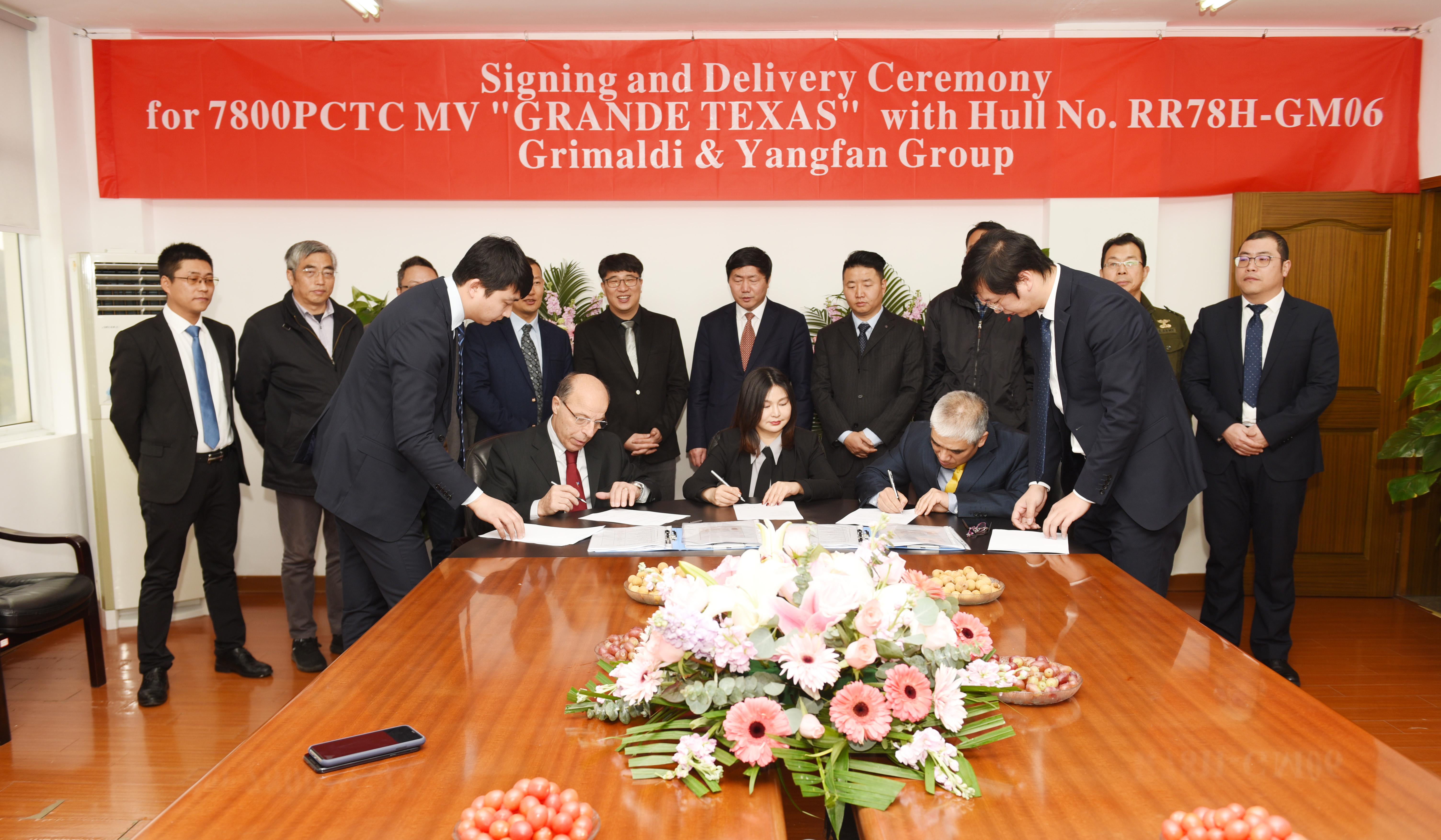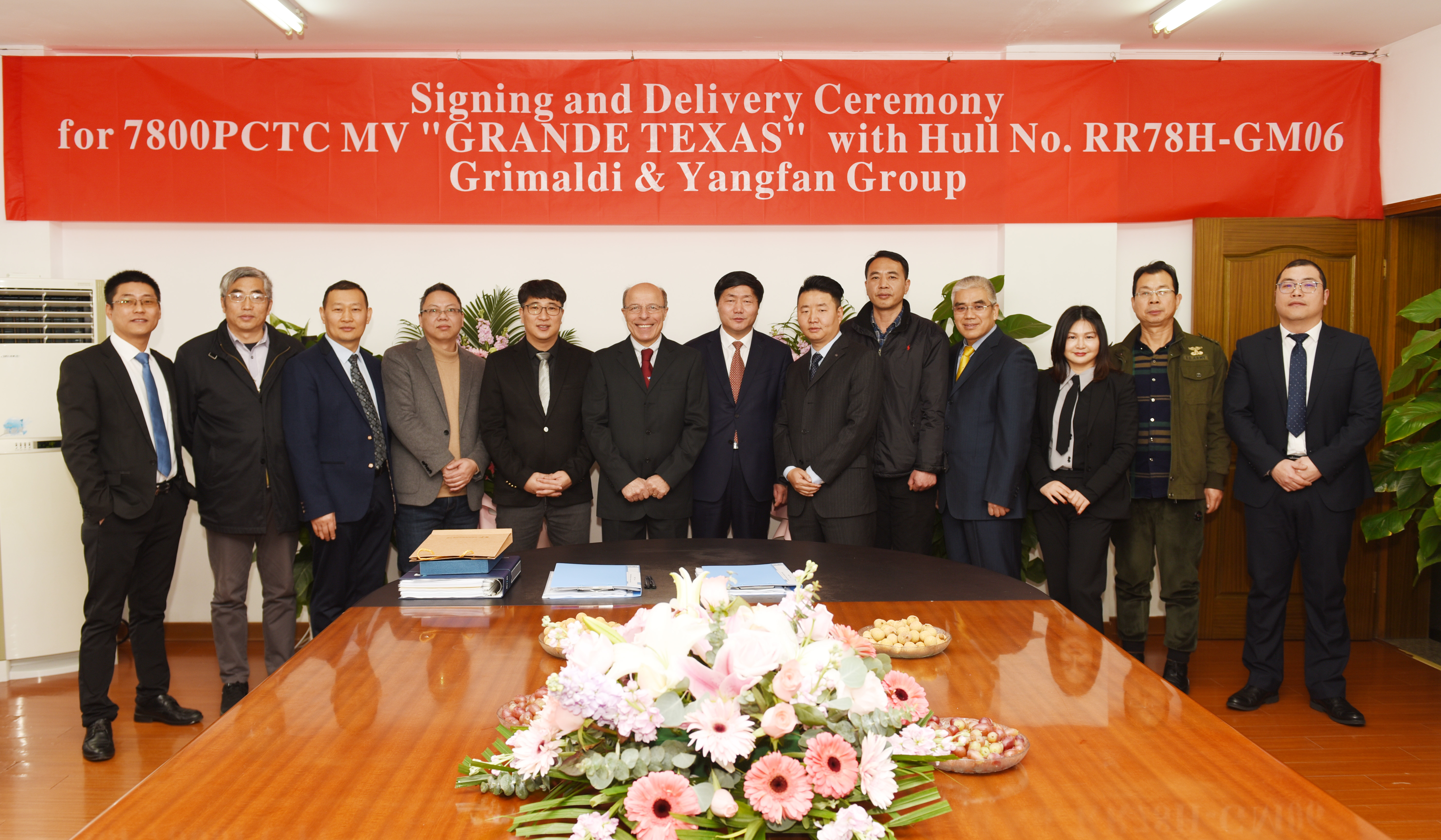 2021年1月26日,由揚(yáng)帆集團(tuán)股份有限公司下屬全資子公司——浙江東海岸船業(yè)有限公司為意大利船東Grimaldi集團(tuán)公司承建的7800車位汽車滾裝船(PCTC)系列船“GRANDE TEXAS"”(船號GM06)正式簽字交付。