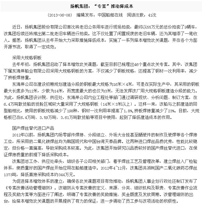 中國船舶在線:揚(yáng)帆集團(tuán):“專案”推動降成本